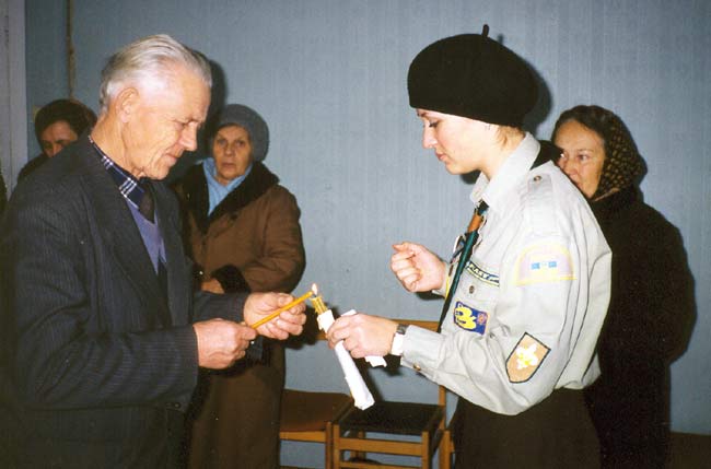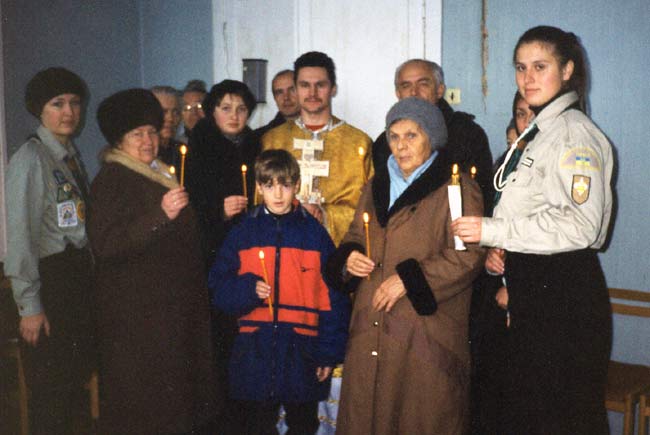 Ст. пл. Зіна Беланюк і ст. пл. Марія Процак, пл. сен. Богдана Процак передавали Віфлеємський вогонь в УАПЦ св. Климента о. Ігорю та його прихожанам.