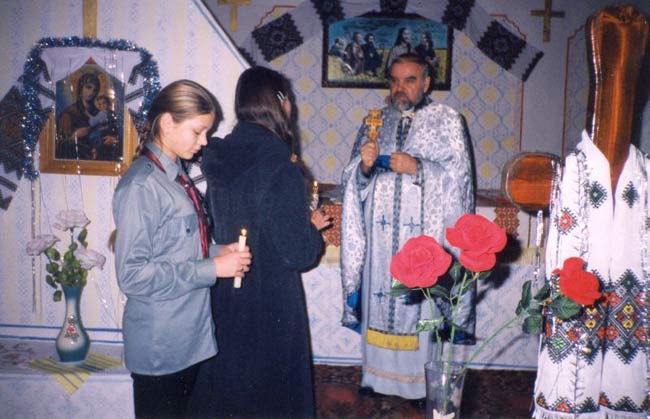 Пл. розв. Саша Єрмошкіна, пл. уч. Саша Гусєва і голова СПС ст. пл. Зіна Беланюк передавали Віфлеємський вогонь о. Петру УГКЦ Андрія Первозванного та його прихожанам.