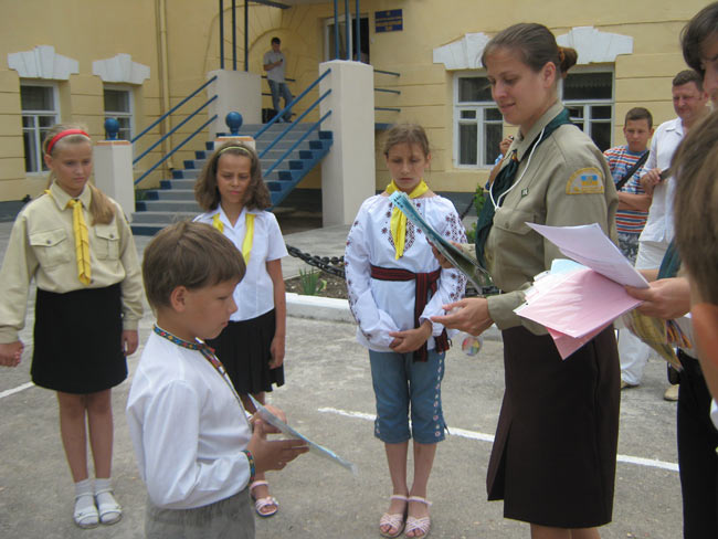 Закриття новацького табору та вручення посвідок за табір. Посвідка вручається виховниці Марії Хотульовій.